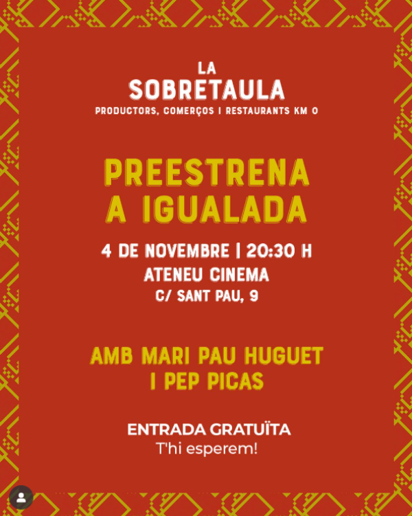 AteneuCinema (Entrada gratuïta)Preestrena del programa “La sobretaula“, amb el capítol dedicat a Igualada i la participació de la Mari Pau Huguet i en Pep Picas. Una nit per descobrir els productors, comerços i restaurants km 0 que donen identitat a la ciutat.