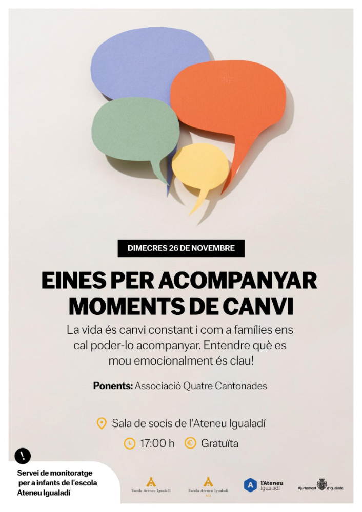 La vida és canvi constant i com a famílies ens cal poder-lo acompanyar. Entendre què es mou emocionalment és clau! A càrrec de l’Associació Quatre Cantonades