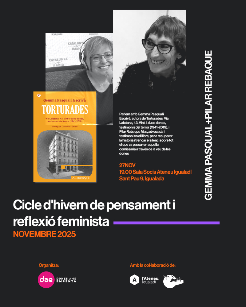Segona edició del cicle d’hivern A foc lent de pensament i reflexió feminista, que organitza Dones amb Empenta a l’entorn del 25N. Parlarem amb Gemma Pasqual i Escrivà, autora de Torturades. Via Laietana, 43. Vint-i-dues dones, testimonis del terror (1941-2019), i Pilar Rebaque Mas, advocada i testimoni al llibre, per a fer memòria històrica i trencar el silenci sobre tot el que va passar en aquella comissaria a través de la veu de les dones.
